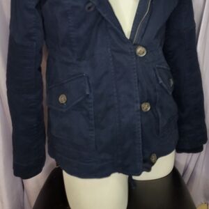 Navy utility jacket with faux fur hood. Button front and cozy lining. Ideal for cold weather.