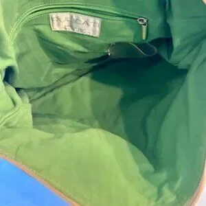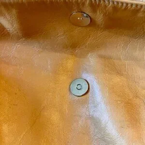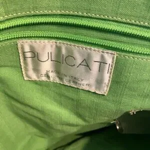 The Pulicati brand is known for their meticulously handcrafted bags with vintage designs and this one if fantastic! Soft creamy beige leather adorned with yellowly gold snake skin detailing and handles. Top zippers and then folds over to a button for style and extra security. Specially crafted sides and bottom offer a clean look whether the bag is semi full or expanded. Large roomy bag has a zippered pocket and cell pouch inside. Great condition.