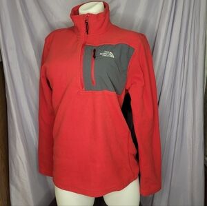 Cozy red fleece with gray chest pocket. Features a quarter-zip design. Ideal for outdoor wear.