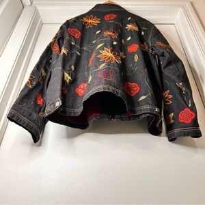 Statement embroidered denim jacket with vibrant red, orange, and golden floral detailing throughout. Features a structured silhouette with a full zip front and contrast stitching for a polished finish. The intricate embroidery pops beautifully against the dark wash denim, making this a true standout piece.