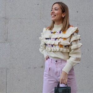 Elegant cream knit sweater with purple floral accents. Ideal for a chic look.