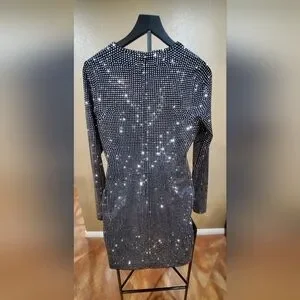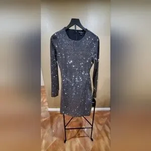 Chic long sleeve dress with shimmering silver accents. Perfect for evening wear. Stylish and modern design.