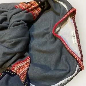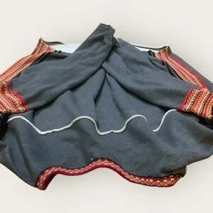 Charcoal gray body with multicolor woven boho sleeve panels and exposed seam detail.