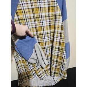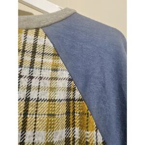 This is a casual plaid sweater with raglan sleeves, featuring a mix of blue, grey, and yellow tones. It offers a relaxed fit, perfect for layering in cooler weather.