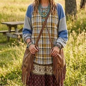 Story Teller Plaid Raglan Sleeve Sweater Model Off Duty Boho NWOT
