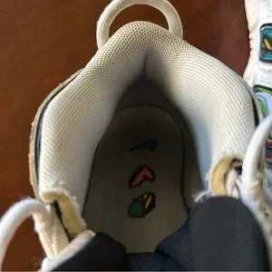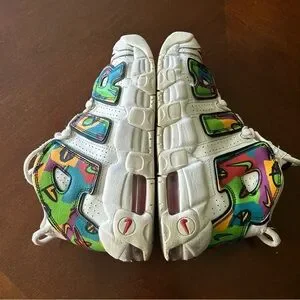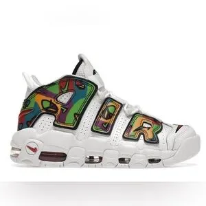 White sneakers with vibrant multicolor patterns. Features secure straps and iconic design.