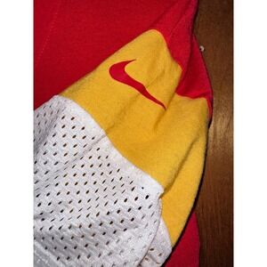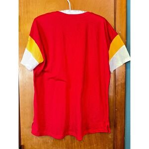 This Nike Kansas City Chiefs shirt is a women's size large red NFL football short sleeves tee. The shirt features a colorblock pattern with a V-neck and pullover closure. It also includes crochet accents and is made by Nike, known for its quality athletic wear. Perfect for fans of the Kansas City Chiefs, this shirt has a regular fit and is ideal for casual wear during the football season.