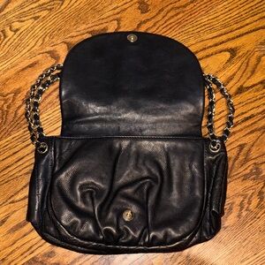Chic Chanel shoulder bag in quilted black leather. Features iconic logo and chain strap.