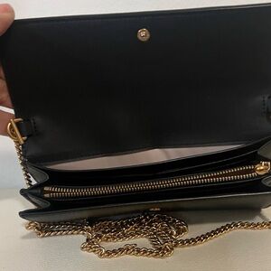 Chic black crossbody bag by Kate Spade. Features a stylish gold chain strap. Perfect for day or night.
