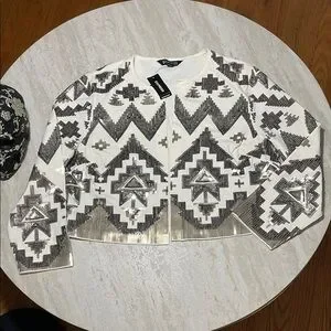 NWT Express Sequin Bronze Gold Ivory Stretch Open Drape Light Crop Blazer *S