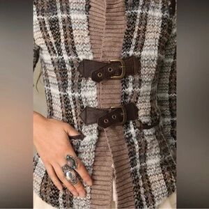 Cozy meets vintage-inspired in this Free People wool blend jacket featuring a textured boucle plaid knit in earthy neutral tones. Designed with rich brown faux leather toggle closures and trim details, this piece gives effortless boho heritage vibes with a touch of rustic charm. Perfect layered over denim, boots, and chunky knits for that relaxed mountain-lodge aesthetic.