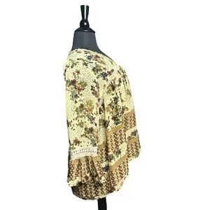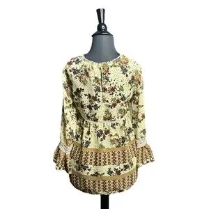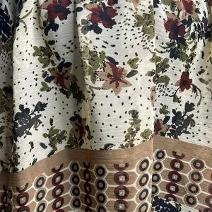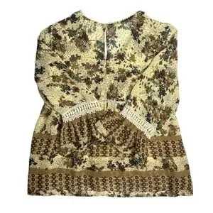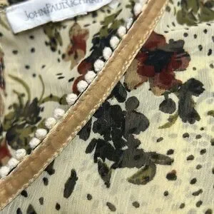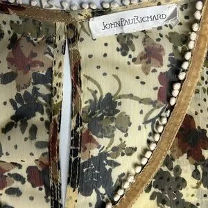 JohnPaulRichard Blouse, item has been used and worn a few times. The item is in good condition and has very limited wear and tear, very lil loose threading, hard to pick up in photos because they are small and camouflage like. The item doesn’t really have stretch to it. Thin and light weight, pair well with layers either under or over. V- neck style with an open back keyhole like style on the back of the top, as seen in photos. The item is also sheer/ see through. The sleeve also stops above wrist, depending on one’s look and/ or preference.