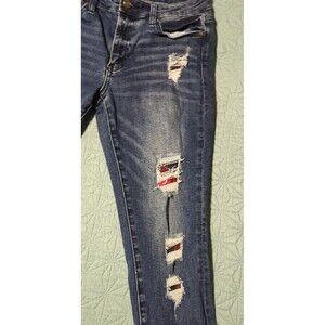 KanCan Jeans Women’s Size 9/28 Skinny Blue Distressed Denim Red Plaid Cotton