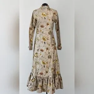 Elegant and timeless silk dress in a champagne-toned satin with warm floral print throughout. Features a high neckline, long sleeves with subtle ruffle cuffs, a flattering fitted waist, and a graceful tiered hem for beautiful movement. Perfect for special occasions, holiday events, or elevated daytime wear.