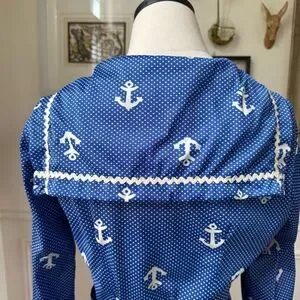 Vintage 70s House of She Ltd Kitchy nautical theme zip front dress in blue featuring all over polkadot and anchor print. Ric rac trim and sailor bib collar. Zips about halfway down the front and there is an optional modesty panel that snaps in place on one side and is pinned in place on the other side because half the snap came off. The anchor belt buckle hooks in the front and the belt itself measures 15.5 inches hook to hook. Laying flat the dress measures 18 inches armpit to armpit and can be unzipped a little more Should you wish. In my opinion, it’s not a deep cut dress so the modesty panel is not really necessary. 15 inches straight across the waist and 19 inches across the hip. No fabric content tag but I would almost guarantee it’s polyester so there is a bit of stretch. measures 34 inches shoulder to hem.
