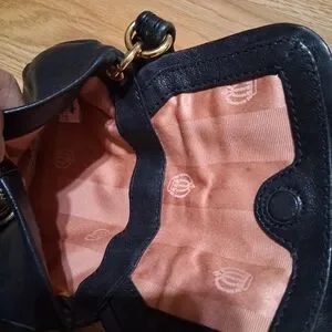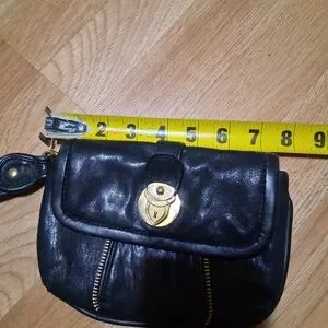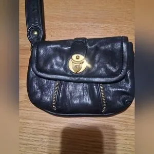 Stylish black leather wristlet featuring gold accents. Perfect for a night out.