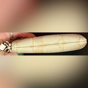 Chic Coach wristlet in cream and beige. Features iconic logo pattern.
