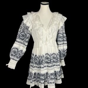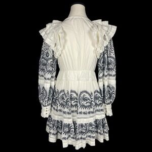 The Ulla Johnson Bridget Embroidered Tiered Mini Dress in size 2 is a Victorian-inspired boho piece perfect for any party or casual occasion. This floral-patterned dress features a V-neckline, long balloon sleeves, and intricate embroidered details, all accented with ruffles and a zipper closure. Made from 100% cotton with a lightweight woven fabric, this short A-line dress is both cozy and stylish, making it ideal for all seasons. The whimsical, fairy-like, designer style of this dress captures the essence of cottagecore aesthetics, blending bohemian flair with romantic charm. Chest measures 34 inches length measures 31 inches