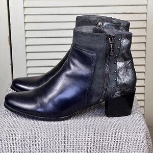 The Nordstrom Regarde Le Ciel Isabel 65 Black Metal Leather Ankle Boots in size EU 41 and US 10 - 10.5 are stylish and versatile footwear for women. MSRP $235 and in excellent condition. With an almond toe shape and block heel, these boots are perfect for casual occasions in the fall, winter, or spring. Made with black leather and a velvet fabric lining, these boots offer a comfortable fit with a mid heel height for added style and stability. Crafted in Spain by the renowned brand Regarde le Ciel, these ankle boots are a fashionable choice for any wardrobe.