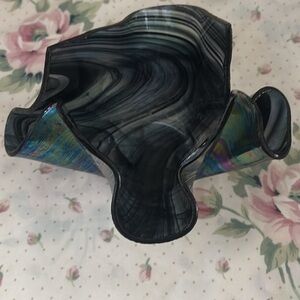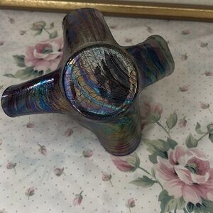 This is a vintage Tony Serviente handmade iridescent hand-blown art glass handkerchief vase.