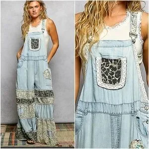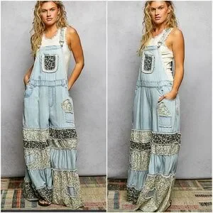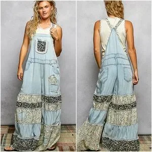 This is a wide leg overall featuring a relaxed, comfortable fit. The legs are designed with layered, ruffled tiers made from mixed printed fabrics, creating a playful and feminine look. The shoulder straps are covered with printed fabric, and the bodice includes decorative trim details, adding a unique and charming touch to the design.