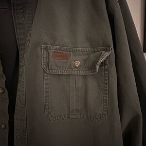 Features chest pockets with button flaps, sturdy buttons, and a washed olive green color that works great with denim or work pants. Soft but substantial fabric with that broken-in Carhartt feel.