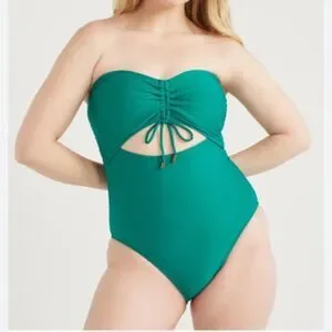 Stylish green strapless one-piece swimsuit with ruched front and cutout detail. Perfect for a chic beach look.