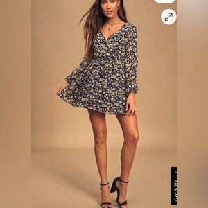Lulus Bloom For Me Navy Blue Floral Print Long Sleeve Skater Dress