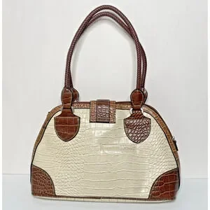 Standout Y2K-inspired handbag with western glam details. Features a cream and brown faux croc embossed vinyl exterior, bold silver-tone buckle accent, and braided double handles. Perfect size for everyday wear with retro rockabilly flair.