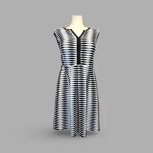 Shelby & Palmer sleeveless fit-and-flare dress stunning blend of style and sophistication. This knee-length piece showcases an eye-catching black and white geometric pattern that creates a captivating optical illusion.