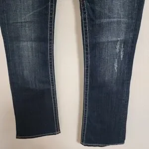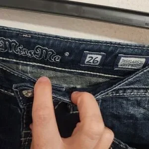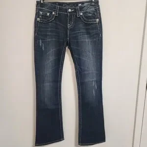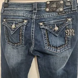 Keywords: Miss Me Jeans, Easy Boot, Dark Wash, Denim Jeans, Low Rise, Embellished Jeans, Distressed Jeans, Bootcut Jeans, Size 26, Women's Jeans, Designer Jeans, Western Jeans