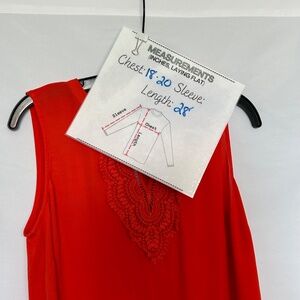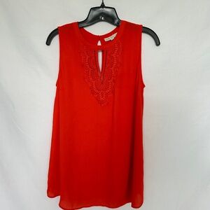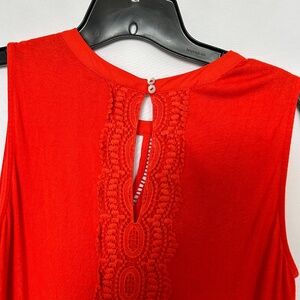 Elevate your style with this vibrant orange top from Pale Sky, featuring intricate lace-like detailing at the neckline and back. The sleeveless design and keyhole back closure add a touch of elegance, making it perfect for both casual and dressy occasions. Made from 100% polyester, this top offers a comfortable and lightweight feel.