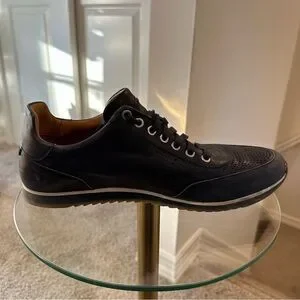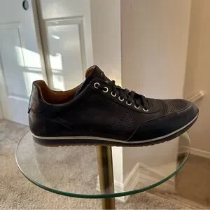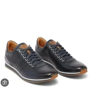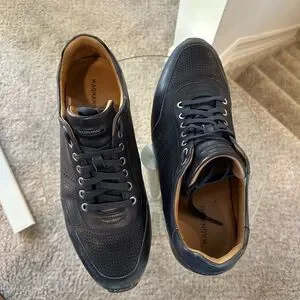 The Magnanni Men's Pueblo Dress Sneaker features hand-finished leather uppers with perforated detailing, leather linings, removable leather footbeds, and combination rubber/leather outsoles.
