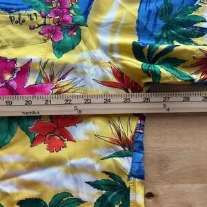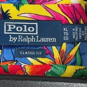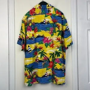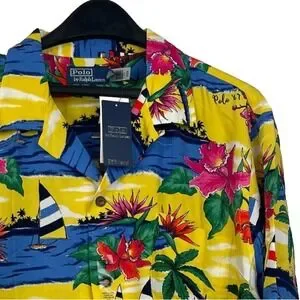 Check out this lightweight and fun 100% Viscose Hawaiian-style button up from Polo Ralph Lauren. This shirt features a bright yellow background with sailboats and tropical flowers.