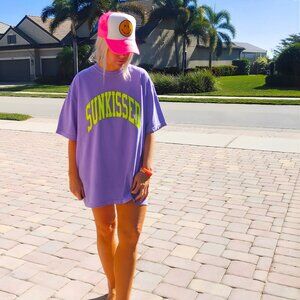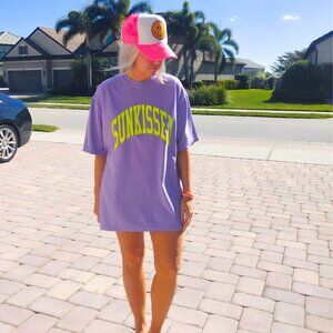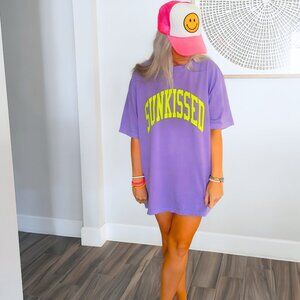 Bright, bold, and made for sunshine — this Sunkissed oversized graphic tee brings all the summer vibes. Designed in vibrant Violet Purple with eye-catching neon yellow lettering, this tee is the perfect mix of soft comfort and statement style. Made using the Comfort Colors brand, this shirt is crafted from 100% cotton for that relaxed, lived-in feel customers love. The breathable fabric and relaxed silhouette make it perfect for beach days, lake trips, vacations, or casual everyday wear. For a trendy, laid-back look, we recommend you size up for an oversized fit. Perfect for summer vacations, spring break, gifting, or anyone who loves bold seasonal style with all-day comfort.