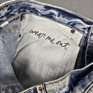 Features: Heavy distressing with shredded patches at the front thigh and knees, additional distressing and frayed detail at the back leg openings, rigid vintage-inspired denim feel, and printed interior pocket bag text reading "wear me out".