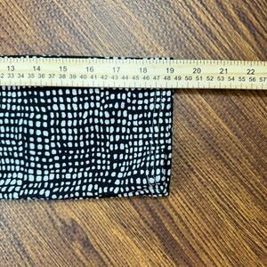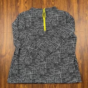 Melloday women’s size Large black and white patterned 1/4 zip top. Features an abstract dot print throughout with a bold yellow contrast zipper for a fun pop of color. Lightweight stretch fabric (95% polyester, 5% spandex) offers comfort and flexibility. Long sleeves with a relaxed tunic-style fit that pairs easily with jeans, leggings, or work pants. Great for casual wear, office layering, or transitional seasons. Modern, eye-catching print with versatile styling options.