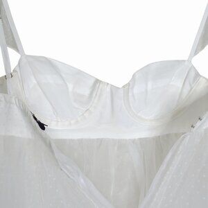 The Bar Kennedy Mini Dress in Blanc White Swiss Dot Tulle. Women’s size 00. Features bustier-style underwire cups with adjustable straps, flutter sleeves, a layered tulle peplum babydoll underlay, back keyhole with hook-and-eye closure, and a lined underskirt with swiss dot ruffle hem. Lightweight sheer tulle with tonal polka dots throughout.