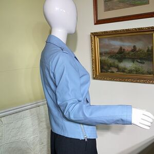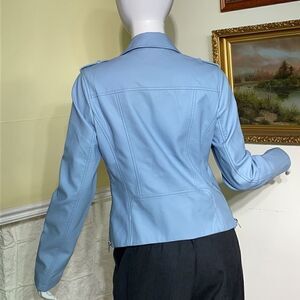 In excellent preowned condition gorgeous baby blue vegan leather motorcycle style jacket features side zippered with a stretch panel that allows your baby bump to grow. Super stylish can be worn after baby is born.