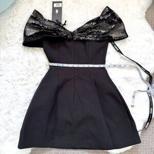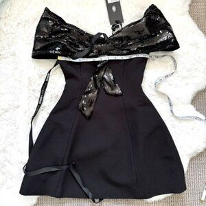 Heiress Sequin Bow Off Shoulder Mini Dress XXS - Black