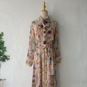 This pink floral print shirt dress with a bow tie is a long-sleeved dress featuring a classic neckline, a bow tie, and a center front button detail.