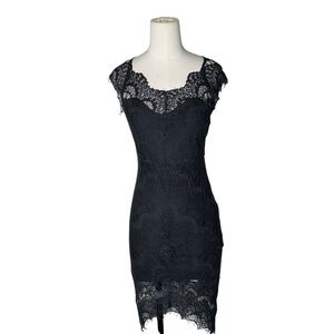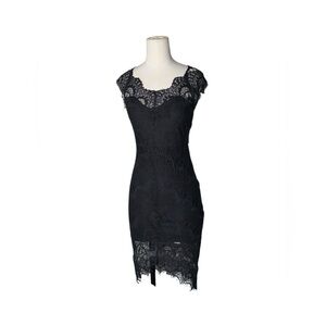 Free People Intimately Peekaboo Lace Hi-Low Dress Women's Size Small This black lace peekaboo slip dress from Free People Intimately features black lace illusion detailing at the neckline and hem with scalloped eyelash trim, a v-neck, slight high low hem, sleeveless / cap sleeve, and an attached slip lining.