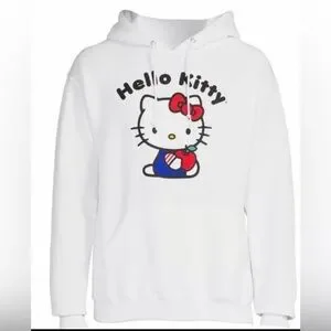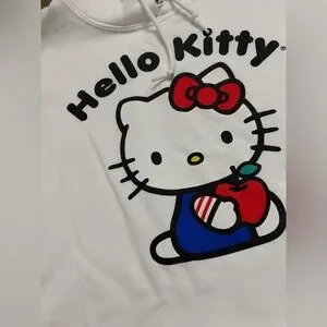 Cozy white hoodie with Hello Kitty design. Features classic Sanrio branding.