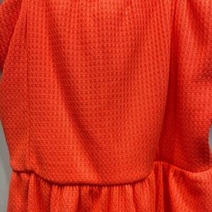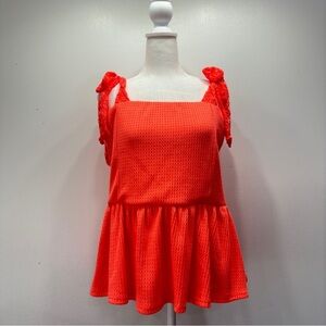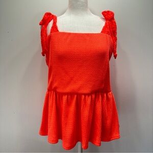 Bibi bold fluorescent orange waffle knit tank top. Lace straps tie into bows at the shoulder. Elastic waist with peplum babydoll ruffle. Super soft and comfy polyester rayon spandex.