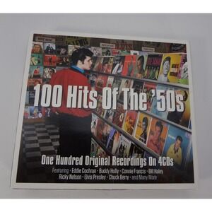 100 Hits Of The 50s a four CD compilation featuring one hundred original recordings from the 1950s. This collection showcases iconic artists and enduring songs that defined the era of rock and roll. Included are hits from artists such as Elvis Presley, Chuck Berry, Buddy Holly, Eddie Cochran, Bill Haley and His Comets, Connie Francis, Ricky Nelson and many more. Near new condition.