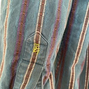 Long sleeve, button flip cuff, collared, extra buttons on inside tag, embroidery logo, embroidered on cuff and hem, knowledge wisdom truth, mixed buttons on cuff, blue and purple detailed stripes. 100% Silk.