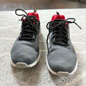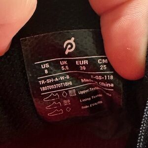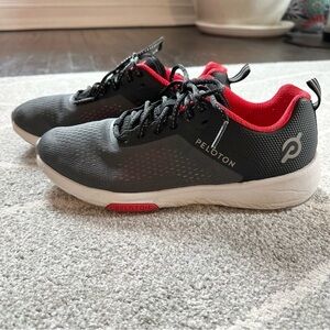 Super comfortable dark charcoal gray training sneakers by Peloton. They have a fun contrasting red interior. They’re in great condition. The only signs of wear are some minor creasing to the sole on the sides, minor wear on the bottoms, and a tiny hole that formed at the back of the left shoe. They look nearly new when you’re wearing them. The original owner just can’t wear them anymore after a foot surgery. Women’s size 8.