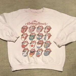 White sweatshirt featuring The Rolling Stones logo. Multicolor tongue graphics with various flag designs.