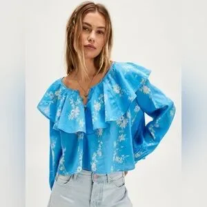 Free People Camilla Printed Blouse NWT blue floral boho Large flowy top