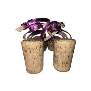 Keywords: platform sandals, purple sandals, chunky heel sandals, square toe sandals, cork sandals, strappy sandals, retro sandals, Y2K sandals, party shoes, summer shoes, wedge sandals, POP sandals, vintage style sandals, dressy sandals, metallic purple